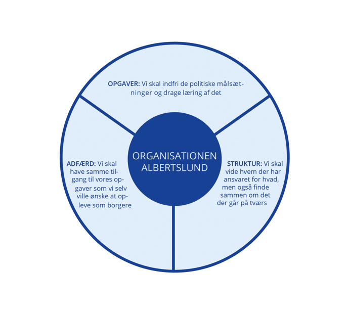 For at arbejde målrettet og struktureret med at skabe de bedste forudsætninger etablerer vi et styringskoncept for Albertslund Kommune, der tager udgangspunkt i de følgende tre perspektiver i vores måde at agere på som organisation: Opgaver, Adfærd og Struktur.